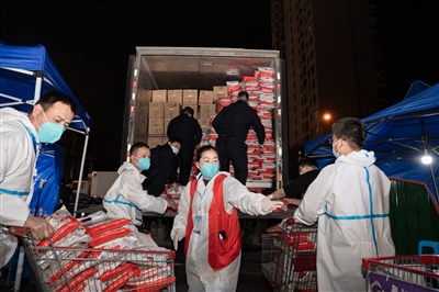 昨日,下沙街道“三区”划定。为保障封控区管控区居民的日常生活,我区有关部门紧急行动,调拨各类防疫物资生活物资“入区”,社区志愿者们也积极主动干起了“搬运工”,这批物资将很快发放到每个家庭。 记者 朱晟 摄