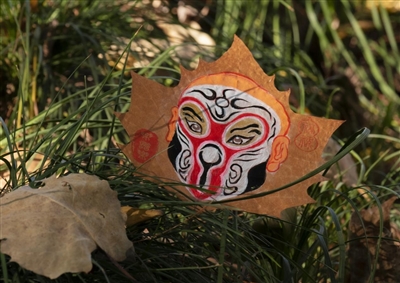 脸谱画的载体不仅仅局限于纸张,形式丰富多样。王宏斌尝试在树叶上画脸谱后,对自己要求近乎严苛,不仅体现在打底、勾线、上色等多个制作环节上,在创作前期,他还会花费大量时间对叶片大小、形态、色泽及完整度等方面层层把关,并将精心挑选出来的落叶洗净,垫上纸巾,压平后置于阴凉处自然阴干,才能得到一张合格的“画纸”。因此,在树叶上描绘一张完整的京剧脸谱,至少需要两天。