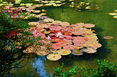 雨后,下沙高教园区的荷塘如同一幅生动的画卷,多片荷叶上残留着晶莹的水珠,透过阳光折射出五彩斑斓的光芒,宛如珍珠撒落。