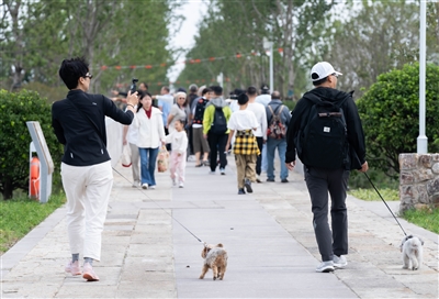 湿地公园内人头攒动,不少游客携带宠物一同游玩。 记者 朱晟 摄