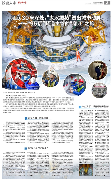眼下,钱塘江江底30米,相当于地下10层楼的深处,杭州机场高铁钱塘江隧道(以下简称“钱塘江隧道”)正在施工。大型机械“轰隆隆”地响,隧道主管时开心爬上盾构机刀盘背面,和工友半蹲着,一圈又一圈拧紧螺栓,动作迅速有力。隧道内闷热潮湿,额头上的汗珠顺着脸颊滑落,却顾不上擦拭,直到确认每一颗螺栓都牢牢“咬紧”,他们才走向下一个作业点。