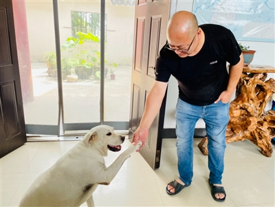 “多多,握手!”沈国良向这只名叫“多多”的狗发号施令,小狗仿佛通人性一般抬起了它的前爪。“这只拉布拉多是老陈女儿抱来的。工作间隙,我们就训练训练它。”沈国良说着便揉了揉多多的脑袋,多多也亲昵地蹭着沈国良的手,这时另一只小黄狗也蹦蹦跳跳地到主人面前示好。“这两只小狗已经陪了我们五六年了,每天在这个院子里蹦来蹦去,捉老鼠、捉蛇,调皮着呢!”两只小狗好像听懂了主任在聊它们的“英雄往事”,忙不迭地站了起来,摇着尾巴,扭着身子,向主人撒娇。“还有一只‘黑猫警长’,今天不知道跑哪里去了。”说起这三只小动物时,沈国良和陈钊荣的脸上便多了几道喜悦的皱纹。