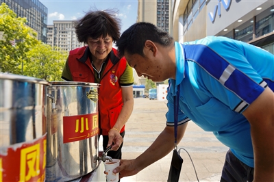据悉,“小凤凉茶”摊提供凉茶、绿豆汤、银耳汤等消暑饮品,每天送出约50斤凉茶。