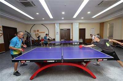 持续的高温天,不少运动爱好者换了“战场”,纷纷走进各社区服务中心运动室,继续享受运动带来的快乐。 图为乒乓球友们在白杨街道西区党群服务中心运动室内切磋球技。 记者 童志忠 摄