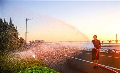 连日来的晴热天气,给城市的景观绿化带来了不少“烤”验。为确保栽种绿化正常生长,我区千方百计给绿化“解渴降温”,一天两次进行全面浇灌。清晨5点多,绿化养护单位就安排工作人员给绿植浇水降温。