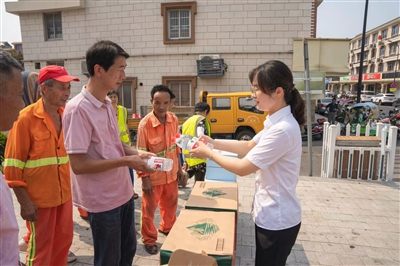 钱塘支行还将饮用水送到了街道环卫工人的手中,提醒他们多喝水,注意防暑降温,保护好身体。“谢谢对我们的关心,我们会将这份情义记在心里。”环卫工人们接过清凉的饮用水,脸上绽放出灿烂的笑容。环卫工人在美丽家园建设中功不可没,钱塘支行用实际行动向高温下的劳动者们致敬,为形成尊重劳动者的社会共识助力,让环卫工人们真正体会到劳动的幸福感。