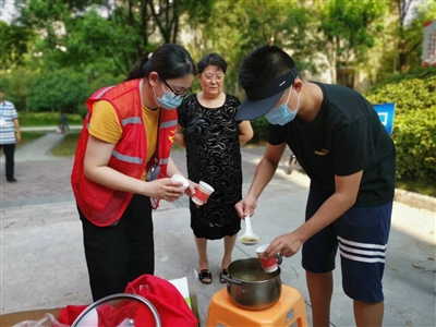 “你们辛苦了!快来喝碗绿豆汤解解暑。”在早城社区湖左岸小区,一名热心业主主动为抗疫一线工作人员送来绿豆汤解暑,感谢他们舍小家为大家的无私奉献。