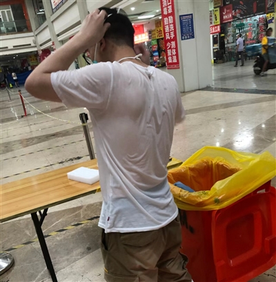自本轮疫情发生以来,我区广大医护人员守望相助,共同奋战在疫情防控一线。图为河庄街道社区卫生服务中心的医生李皇杰,奋战在“疫”线,出汗到全身湿透。