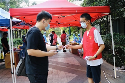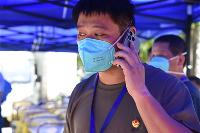 在核酸检测现场,20岁的方森泽穿着蓝色防护服,正熟练地操作扫码。1.85米的大高个在狭窄的采样亭显得有点局促,他笑笑说:“刚开始有点不习惯,现在已经很适应了。”