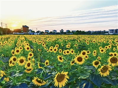 近日,河庄街道文伟村、新创村两处共26.5亩的向日葵花海进入盛放期。在阳光的照耀下,金黄色的向日葵层层叠叠,映满眼帘。沿路赏花,美得像一幅油画。