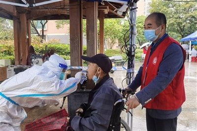 “大哥,我来推着你,咱们走绿色通道!”10月7日早上,阴雨绵绵,住在下沙街道智格社区新怡家园的吴柏根穿上厚实的衣服,坐在轮椅上,由家人推着来到核酸采样点。采样点位上,负责维持秩序的社区志愿者高尔良看见吴柏根的家人在忙着排队扫码,他快步走到吴柏根身边,帮他推轮椅。