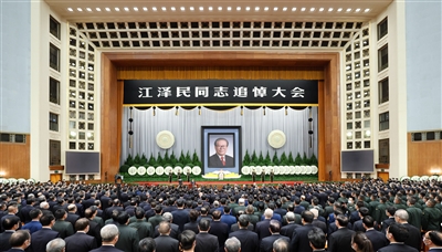 今天,我们在首都人民大会堂隆重举行追悼大会,极其沉痛地悼念敬爱的江泽民同志。