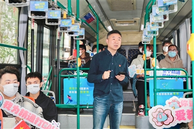 在一辆充满青春元素的巴士上,来自区融媒体中心记者宣讲团的成员周爱国正结合自身工作实际宣讲党的二十大精神,让20多名“乘客”学生开启了一场特殊的“钱塘智造”探索之旅。