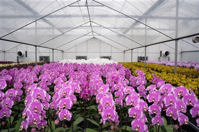 寒潮来,气温骤降,河庄街道新围村远鸿花卉的大棚内,却是阵阵暖意涌动。恒温20℃的大棚内,200余亩的蝴蝶兰“待字闺中”,将陆续上市。 记者 朱晟 摄