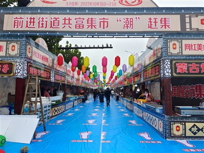 走近一看,古色古香的装饰,点缀着五彩斑斓的灯笼,一个个摊位一字排开,清一色的招牌上,红色大字誊写着每个摊位的特色产品,网红小吃、生活用品、娱乐设施应有尽有。