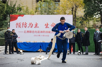 本报讯 近日,由白杨街道云涛联合社区主办的消防技能比武大赛在东郡国际朗湾小区举行,辖区6家物业单位的30名选手参加比赛。