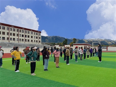 金磊还将“钱塘365”的音乐和“tabata”燃脂操加入到大课间的编排中。从前期的音乐编辑、操化编排,到后期整体演练,他带着大家一遍又一遍地练习,不厌其烦地为大家示范、讲解。时间的累积、汗水的播撒,让学校的大课间活动得到了质的改变,也让钱塘文化和藏族特色完美融合到了一起。